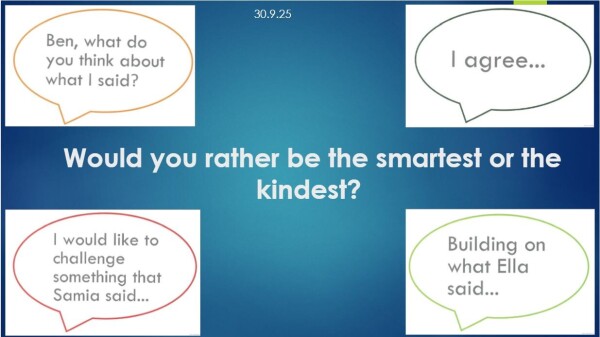 We promote and encourage purposeful talk, but also listening. With our 'Talking Tuesday' activities, children get the opportunity, with the support of question sentence stems, to share their ideas and challenge each other. There is never and right or wrong answer; just discussion and ideas sharing.
